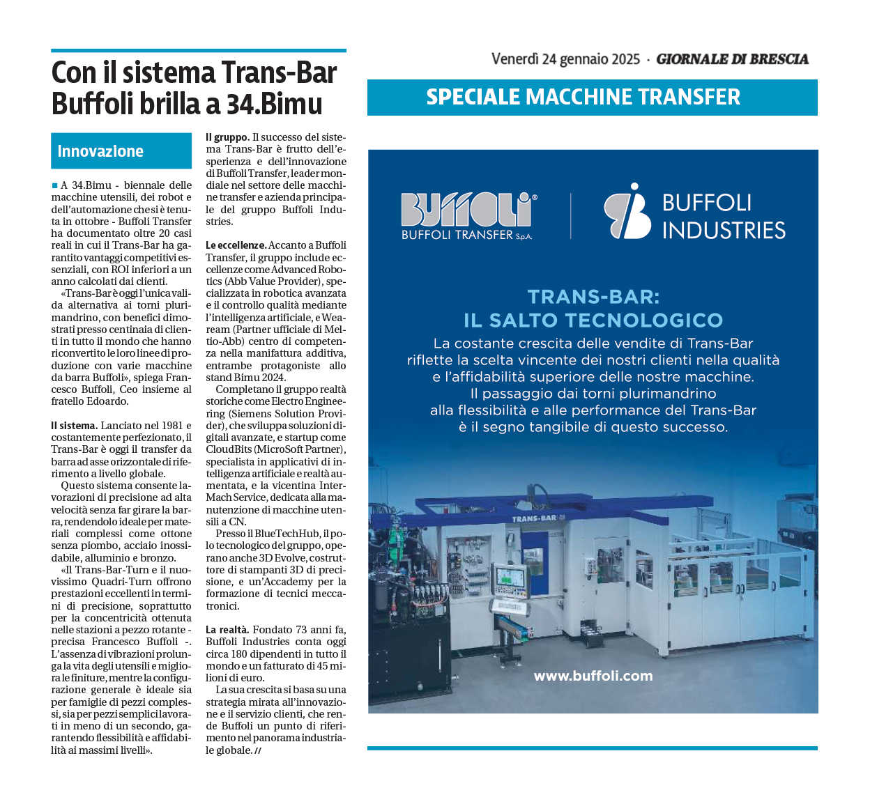 Buffoli Transfer continua a puntare su qualità e innovazione, offrendo ai clienti soluzioni tecnologiche avanzate per affrontare le sfide della produzione moderna.