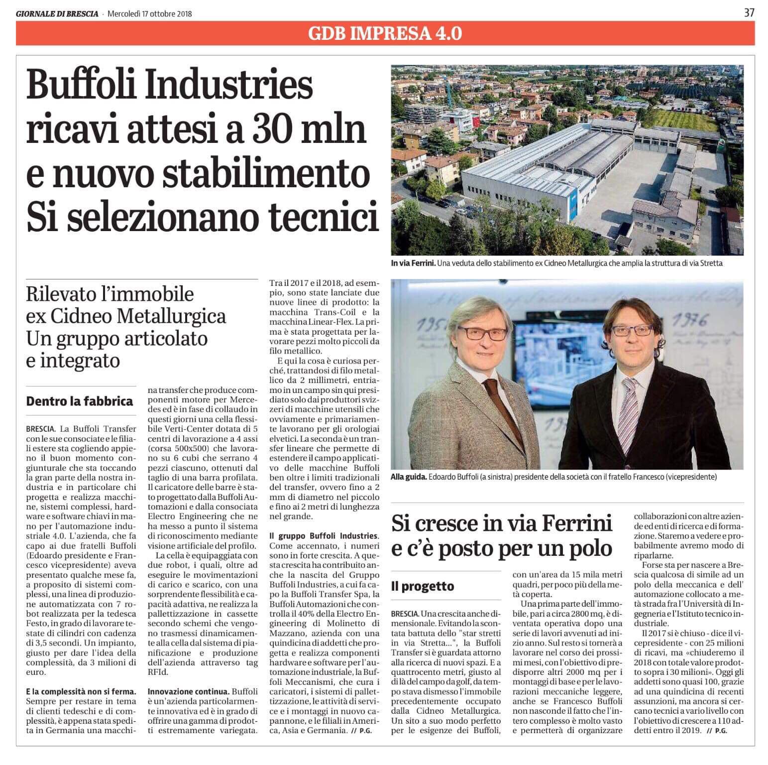 "Impresa 4.0", un focus pubblicato sul Giornale di Brescia di oggi, approfondisce i risultati ottenuti da Buffoli Industries nel 2018, con particolare riguardo verso il nuovo stabilimento in Via Ferrini e le nuove macchine transfer prodotte per Festo e Mercedes.